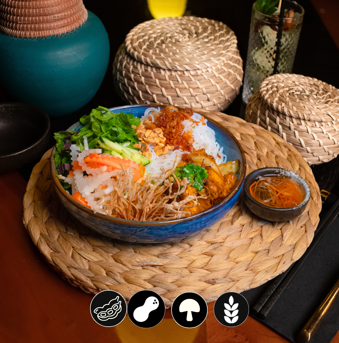 With Tofu, Perilla, Mint, Basil, Cucumber, Pickled Daikon Carrot, Lime Fish Sauce, Rice Noodles, Fried Shallot, (With or Without) Peanut