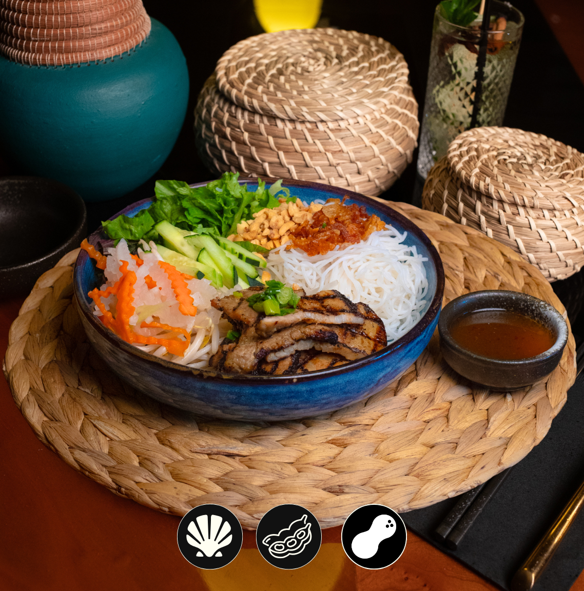 Grill Pork Belly, Perilla, Mint, Basil, Cucumber, Pickled Daikon Carrot, Lime Fish Sauce, Rice Noodles, Fried Shallot, (With or Without) Peanut